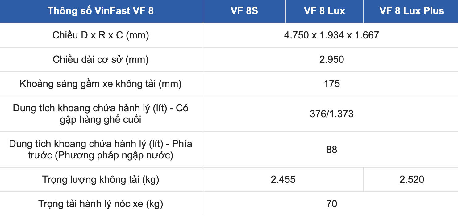VF8 có kích thước rộng rãi, chiều dài cơ sở lớn giúp không gian cabin rộng rãi và ổn định khi vận hành.